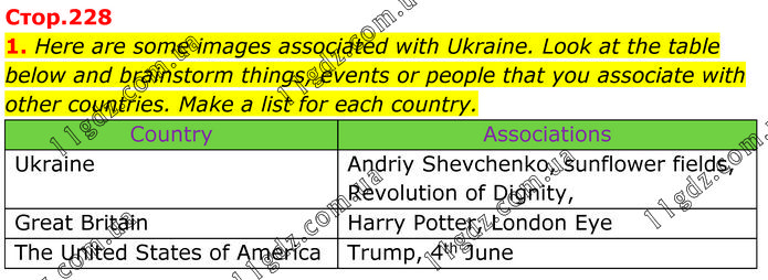 Here are some images associated with Ukraine. Look at the table below and brainstorm things, events or people that you associate with other countries. Make a list for each country.