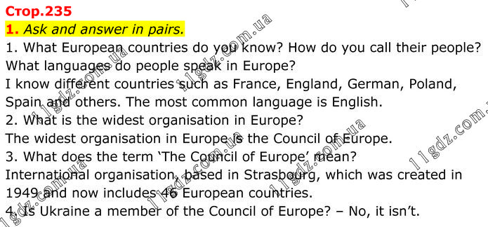 Ask and answer in pairs. 1. What European countries do you know? How do you call their people? What languages do people speak in Europe? I know different countries such as France, England, German, Poland, Spain and others. The most common language is English. 2. What is the widest organisation in Europe? The widest organisation in Europe is the Council of Europe. 3. What does the term ‘The Council of Europe’ mean? International organisation, based in Strasbourg, which was created in 1949 and now includes 46 European countries. 4. Is Ukraine a member of the Council of Europe? – No, it isn’t.