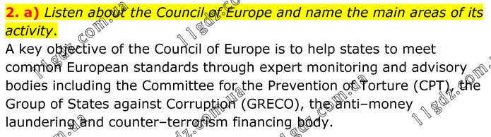 Listen about the Council of Europe and name the main areas of its activity. A key objective of the Council of Europe is to help states to meet common European standards through expert monitoring and advisory bodies including the Committee for the Prevention of Torture (CPT), the Group of States against Corruption (GRECO), the anti–money laundering and counter–terrorism financing body.