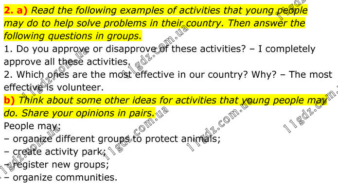 a) Read the following examples of activities that young people may do to help solve problems in their country. Then answer the following questions in groups. 1. Do you approve or disapprove of these activities? – I completely approve all these activities. 2. Which ones are the most effective in our country? Why? – The most effective is volunteer. b) Think about some other ideas for activities that young people may do. Share your opinions in pairs. People may: – organize different groups to protect animals; – create activity park; – register new groups; – organize communities.