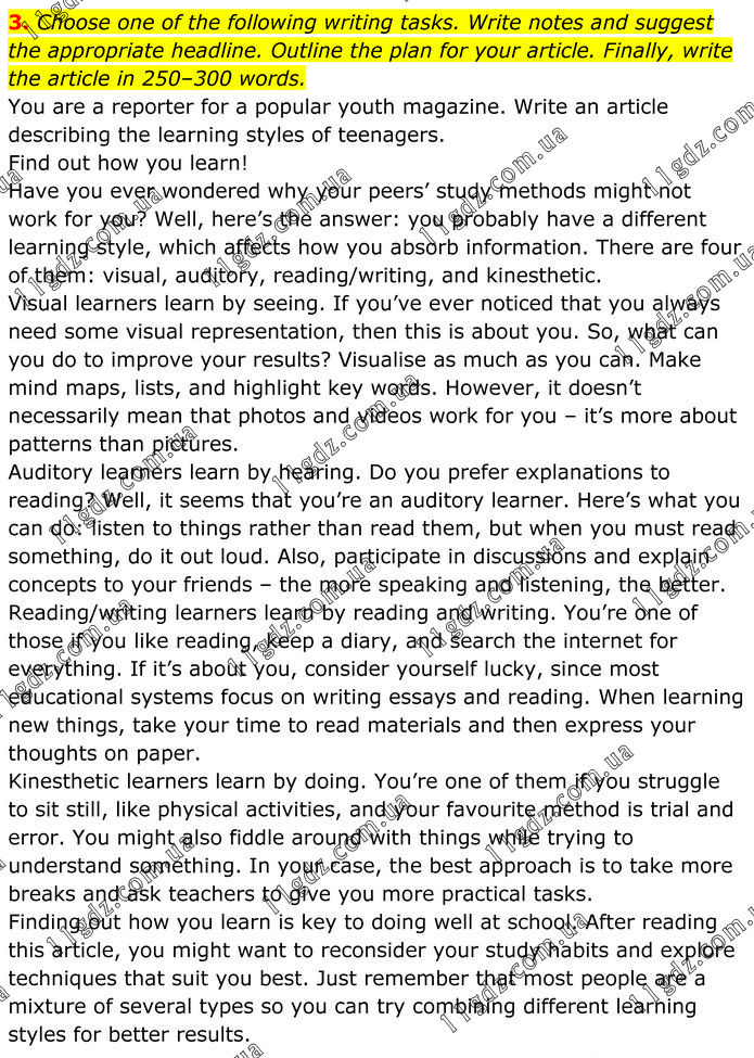 Choose one of the following writing tasks. Write notes and suggest the appropriate headline. Outline the plan for your article. Finally, write the article in 250–300 words. You are a reporter for a popular youth magazine. Write an article describing the learning styles of teenagers. Find out how you learn! Have you ever wondered why your peers’ study methods might not work for you? Well, here’s the answer: you probably have a different learning style, which affects how you absorb information. There are four of them: visual, auditory, reading/writing, and kinesthetic. Visual learners learn by seeing. If you’ve ever noticed that you always need some visual representation, then this is about you. So, what can you do to improve your results? Visualise as much as you can. Make mind maps, lists, and highlight key words. However, it doesn’t necessarily mean that photos and videos work for you – it’s more about patterns than pictures. Auditory learners learn by hearing. Do you prefer explanations to reading? Well, it seems that you’re an auditory learner. Here’s what you can do: listen to things rather than read them, but when you must read something, do it out loud. Also, participate in discussions and explain concepts to your friends – the more speaking and listening, the better. Reading/writing learners learn by reading and writing. You’re one of those if you like reading, keep a diary, and search the internet for everything. If it’s about you, consider yourself lucky, since most educational systems focus on writing essays and reading. When learning new things, take your time to read materials and then express your thoughts on paper. Kinesthetic learners learn by doing. You’re one of them if you struggle to sit still, like physical activities, and your favourite method is trial and error. You might also fiddle around with things while trying to understand something. In your case, the best approach is to take more breaks and ask teachers to give you more practical tasks. Finding out how you learn is key to doing well at school. After reading this article, you might want to reconsider your study habits and explore techniques that suit you best. Just remember that most people are a mixture of several types so you can try combining different learning styles for better results.