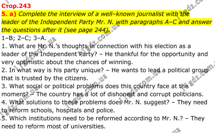 Complete the interview of a well–known journalist with the leader of the Independent Party Mr. N. with paragraphs A–C and answer the questions after it (see page 244). 1–B; 2–C; 3–A. 1. What are Mr. N.’s thoughts in connection with his election as a leader of the Independent Party? – He thankful for the opportunity and very optimistic about the chances of winning. 2. In what way is his party unique? – He wants to lead a political group that is trusted by the citizens. 3. What social or political problems does this country face at the moment? – The country has a lot of dishonest and corrupt politicians. 4. What solutions to these problems does Mr. N. suggest? – They need to reform schools, hospitals and police. 5. Which institutions need to be reformed according to Mr. N.? – They need to reform most of universities.