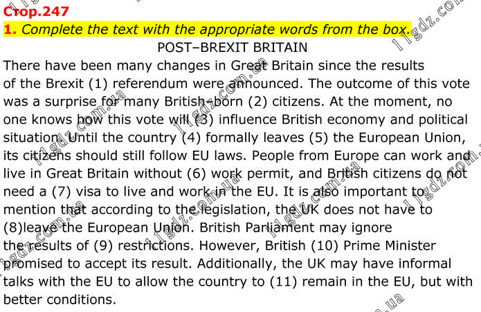 Complete the text with the appropriate words from the box. POST–BREXIT BRITAIN There have been many changes in Great Britain since the results of the Brexit (1) referendum were announced. The outcome of this vote was a surprise for many British–born (2) citizens. At the moment, no one knows how this vote will (3) influence British economy and political situation. Until the country (4) formally leaves (5) the European Union, its citizens should still follow EU laws. People from Europe can work and live in Great Britain without (6) work permit, and British citizens do not need a (7) visa to live and work in the EU. It is also important to mention that according to the legislation, the UK does not have to (8)leave the European Union. British Parliament may ignore the results of (9) restrictions. However, British (10) Prime Minister promised to accept its result. Additionally, the UK may have informal talks with the EU to allow the country to (11) remain in the EU, but with better conditions.