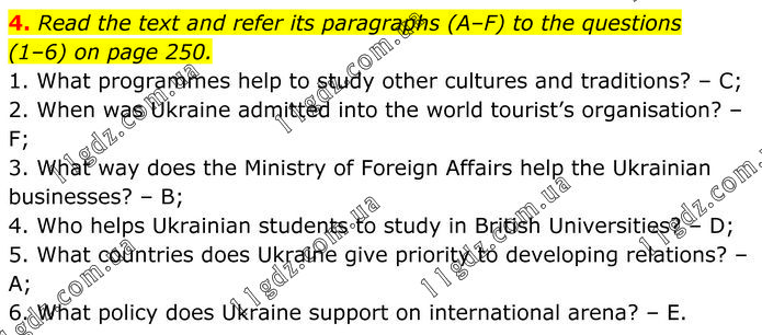 Read the text and refer its paragraphs (A–F) to the questions (1–6) on page 250. 1. What programmes help to study other cultures and traditions? – C; 2. When was Ukraine admitted into the world tourist’s organisation? – F; 3. What way does the Ministry of Foreign Affairs help the Ukrainian businesses? – B; 4. Who helps Ukrainian students to study in British Universities? – D; 5. What countries does Ukraine give priority to developing relations? – A; 6. What policy does Ukraine support on international arena? – E.
