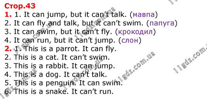 1. It can jump, but it can’t talk. (мавпа) 2. It can fly and talk, but it can’t swim. (папуга) 3. It can swim, but it can’t fly. (крокодил) 4. It can run, but it can’t jump. (слон) 2. 1. This is a parrot. It can fly. 2. This is a cat. It can’t swim. 3. This is a rabbit. It can jump. 4. This is a dog. It can’t talk. 5. This is a penguin. It can swim. 6. This is a snake. It can’t run.