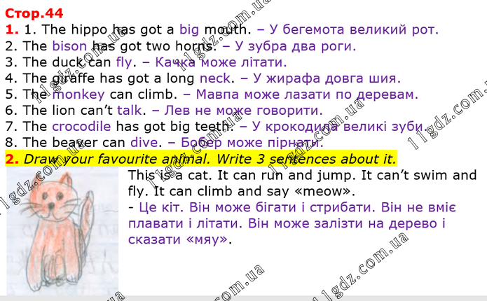 1. The hippo has got a big mouth. – У бегемота великий рот. 2. The bison has got two horns. – У зубра два роги. 3. The duck can fly. – Качка може літати. 4. The giraffe has got a long neck. – У жирафа довга шия. 5. The monkey can climb. – Мавпа може лазати по деревам. 6. The lion can’t talk. – Лев не може говорити. 7. The crocodile has got big teeth. – У крокодила великі зуби. 8. The beaver can dive. – Бобер може пірнати. 2. Draw your favourite animal. Write 3 sentences about it. This is a cat. It can run and jump. It can’t swim and fly. It can climb and say «meow». Намалюй улюблену тварину. Напишіть про це 3 речення. - Це кіт. Він може бігати і стрибати. Він не вміє плавати і літати. Він може залізти на дерево і сказати «мяу».