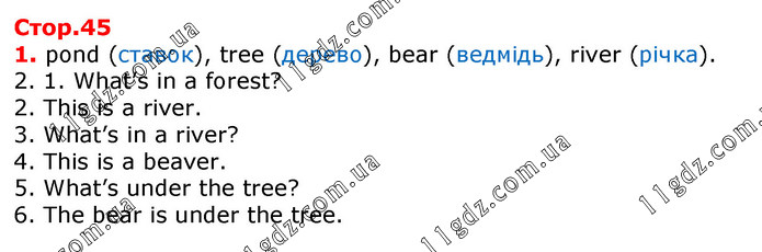 pond (ставок), tree (дерево), bear (ведмідь), river (річка). 2. 1. What’s in a forest? 2. This is a river. 3. What’s in a river? 4. This is a beaver. 5. What’s under the tree? 6. The bear is under the tree