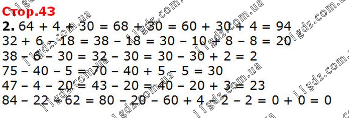 64 + 4 + 30 = 68 + 30 = 60 + 30 + 4 = 94 32 + 6 – 18 = 38 – 18 = 30 – 10 + 8 – 8 = 20 38 – 6 – 30 = 32 – 30 = 30 – 30 + 2 = 2 75 – 40 – 5 = 70 – 40 + 5 – 5 = 30 47 – 4 – 20 = 43 – 20 = 40 – 20 + 3 = 23 84 – 22 – 62 = 80 – 20 – 60 + 4 – 2 – 2 = 0 + 0 = 0
