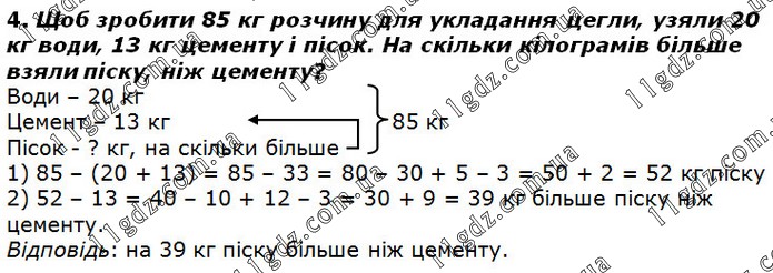 Щоб зробити 85 кг розчину для укладання цегли, узяли 20 кг води, 13 кг цементу і пісок. На скільки кілограмів більше взяли піску, ніж цементу?