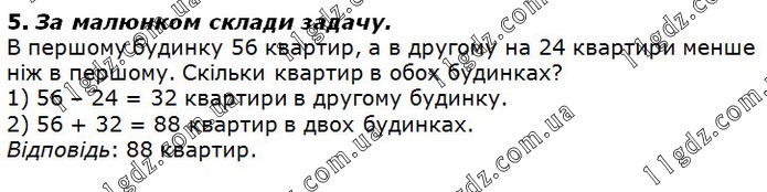 5. За малюнком склади задачу. В першому будинку 56 квартир, а в другому на 24 квартири менше ніж в першому. Скільки квартир в обох будинках? 1) 56 – 24 = 32 квартири в другому будинку. 2) 56 + 32 = 88 квартир в двох будинках. Відповідь: 88 квартир.