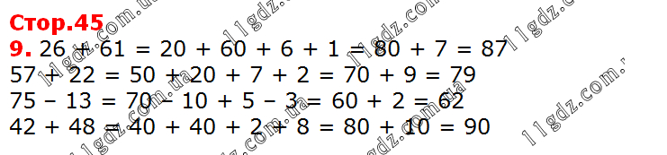 9. 26 + 61 = 20 + 60 + 6 + 1 = 80 + 7 = 87 57 + 22 = 50 + 20 + 7 + 2 = 70 + 9 = 79 75 – 13 = 70 – 10 + 5 – 3 = 60 + 2 = 62 42 + 48 = 40 + 40 + 2 + 8 = 80 + 10 = 90