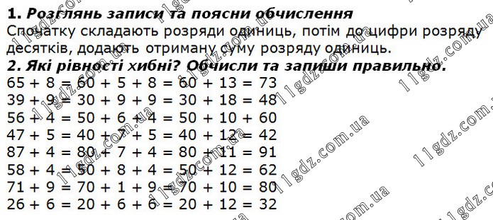 1. Розглянь записи та поясни обчислення Спочатку складають розряди одиниць, потім до цифри розряду десятків, додають отриману суму розряду одиниць. 2. Які рівності хибні? Обчисли та запиши правильно. 65 + 8 = 60 + 5 + 8 = 60 + 13 = 73 39 + 9 = 30 + 9 + 9 = 30 + 18 = 48 56 + 4 = 50 + 6 + 4 = 50 + 10 + 60 47 + 5 = 40 + 7 + 5 = 40 + 12 = 42 87 + 4 = 80 + 7 + 4 = 80 + 11 = 91 58 + 4 = 50 + 8 + 4 = 50 + 12 = 62 71 + 9 = 70 + 1 + 9 = 70 + 10 = 80 26 + 6 = 20 + 6 + 6 = 20 + 12 = 32