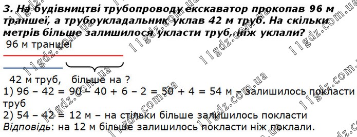 На будівництві трубопроводу екскаватор прокопав 96 м траншеї, а трубоукладальник уклав 42 м труб. На скільки метрів більше залишилося укласти труб, ніж уклали?