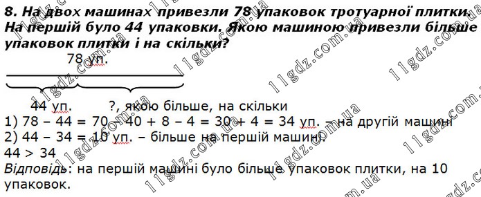 8. На двох машинах привезли 78 упаковок тротуарної плитки. На першій було 44 упаковки. Якою машиною привезли більше упаковок плитки і на скільки?