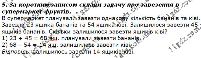 За коротким записом склади задачу про завезення в супермаркет фруктів. В супермаркет планували завезти однакову кількість бананів та ківі. Завезли 23 ящика бананів та 54 ящика ківі. Залишилося завезти 45 ящиків бананів. Скільки залишилося завезти ящиків ківі? 1) 23 + 45 = 68 ящ. планували завезти бананів. 2) 68 – 54 = 14 ящ. залишилось завезти ківі. Відповідь: залишилось завезти 14 ящиків ківі.