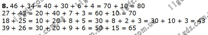 46 + 34 = 40 + 30 + 6 + 4 = 70 + 10 = 80 27 + 43 = 20 + 40 + 7 + 3 = 60 + 10 = 70 18 + 25 = 10 + 20 + 8 + 5 = 30 + 8 + 2 + 3 = 30 + 10 + 3 = 43 39 + 26 = 30 + 20 + 9 + 6 = 50 + 15 = 65