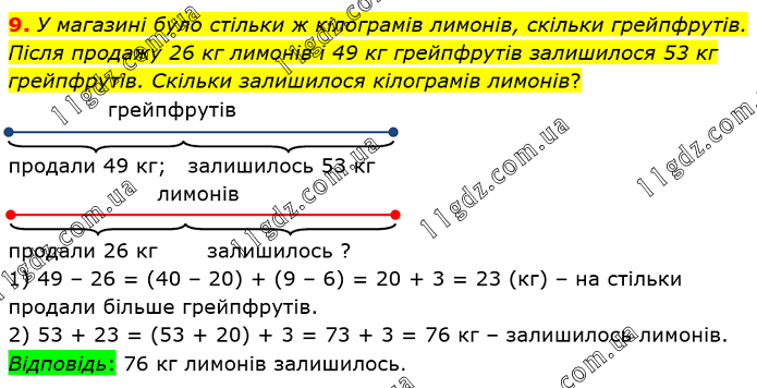 У магазині було стільки ж кілограмів лимонів, скільки грейпфрутів. Після продажу 26 кг лимонів і 49 кг грейпфрутів залишилося 53 кг грейпфрутів. Скільки залишилося кілограмів лимонів? 1) 49 – 26 = (40 – 20) + (9 – 6) = 20 + 3 = 23 (кг) – на стільки продали більше грейпфрутів. 2) 53 + 23 = (53 + 20) + 3 = 73 + 3 = 76 кг – залишилось лимонів. Відповідь: 76 кг лимонів залишилось.