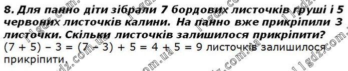 Для панно діти зібрали 7 бордових листочків груші і 5 червоних листочків калини. На панно вже прикріпили 3 листочки. Скільки листочків залишилося прикріпити?