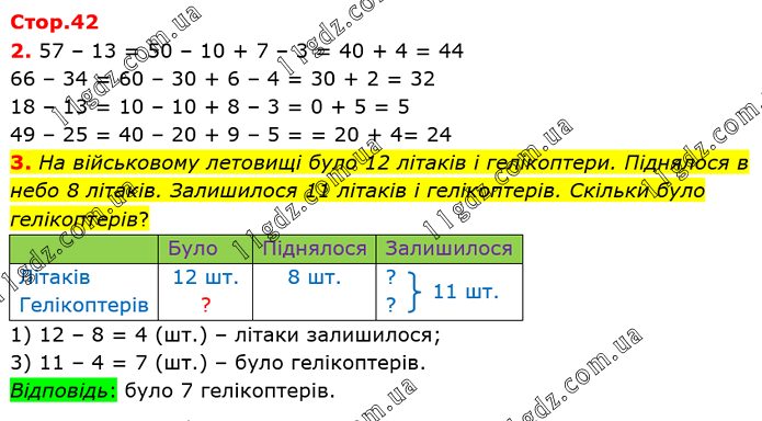 2. 57 – 13 = 50 – 10 + 7 – 3 = 40 + 4 = 44 66 – 34 = 60 – 30 + 6 – 4 = 30 + 2 = 32 18 – 13 = 10 – 10 + 8 – 3 = 0 + 5 = 5 49 – 25 = 40 – 20 + 9 – 5 = = 20 + 4= 24 3. На військовому летовищі було 12 літаків і гелікоптери. Піднялося в небо 8 літаків. Залишилося 11 літаків і гелікоптерів. Скільки було гелікоптерів? 1) 12 – 8 = 4 (шт.) – літаки залишилося; 3) 11 – 4 = 7 (шт.) – було гелікоптерів. Відповідь: було 7 гелікоптерів.