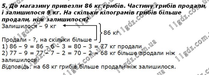 До магазину привезли 86 кг грибів. Частину грибів продали, і залишилося 9 кг. На скільки кілограмів грибів більше продали, ніж залишилося?