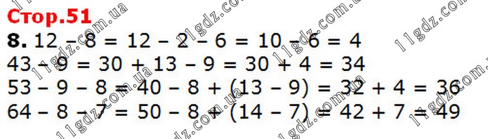 12 – 8 = 12 – 2 – 6 = 10 – 6 = 4 43 – 9 = 30 + 13 – 9 = 30 + 4 = 34 53 – 9 – 8 = 40 – 8 + (13 – 9) = 32 + 4 = 36 64 – 8 – 7 = 50 – 8 + (14 – 7) = 42 + 7 = 49