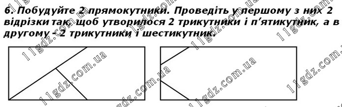 Побудуйте 2 прямокутники. Проведіть у першому з них 2 відрізки так, щоб утворилося 2 трикутники і п’ятикутник, а в другому - 2 трикутники і шестикутник