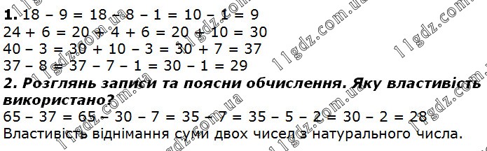 18 – 9 = 18 – 8 – 1 = 10 – 1 = 9 24 + 6 = 20 + 4 + 6 = 20 + 10 = 30 40 – 3 = 30 + 10 – 3 = 30 + 7 = 37 37 – 8 = 37 – 7 – 1 = 30 – 1 = 29 2. Розглянь записи та поясни обчислення. Яку властивість використано? 65 – 37 = 65 – 30 – 7 = 35 – 7 = 35 – 5 – 2 = 30 – 2 = 28 Властивість віднімання суми двох чисел з натурального числа.