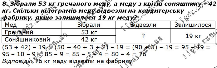 Зібрали 53 кг гречаного меду, а меду з квітів соняшнику - 42 кг. Скільки кілограмів меду відвезли на кондитерську фабрику, якщо залишилося 19 кг меду?