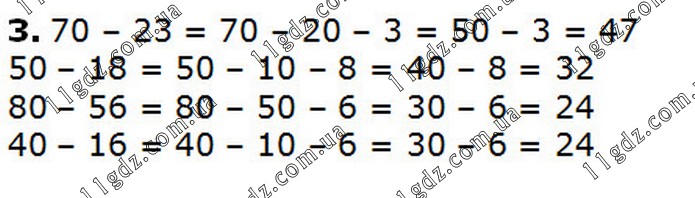 3. 70 – 23 = 70 – 20 – 3 = 50 – 3 = 47 50 – 18 = 50 – 10 – 8 = 40 – 8 = 32 80 – 56 = 80 – 50 – 6 = 30 – 6 = 24 40 – 16 = 40 – 10 – 6 = 30 – 6 = 24