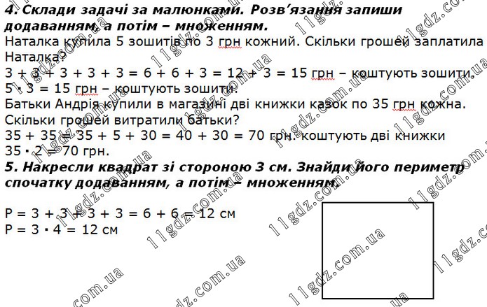 Накресли квадрат зі стороною 3 см. Знайди його периметр спочатку додаванням, а потім – множенням