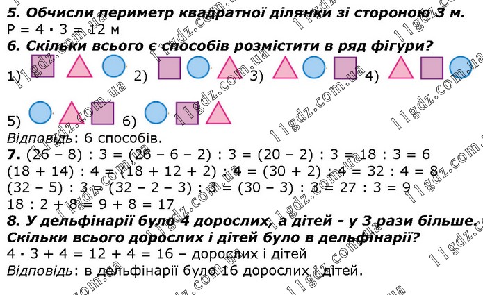5. Обчисли периметр квадратної ділянки зі стороною 3 м. Р = 4 · 3 = 12 м 6. Скільки всього є способів розмістити в ряд фігури? 1) 2) 3) 4) 5) 6) Відповідь: 6 способів. 7. (26 – 8) : 3 = (26 – 6 – 2) : 3 = (20 – 2) : 3 = 18 : 3 = 6 (18 + 14) : 4 = (18 + 12 + 2) : 4 = (30 + 2) : 4 = 32 : 4 = 8 (32 – 5) : 3 = (32 – 2 – 3) : 3 = (30 – 3) : 3 = 27 : 3 = 9 18 : 2 + 8 = 9 + 8 = 17 8. У дельфінарії було 4 дорослих, а дітей - у 3 рази більше. Скільки всього дорослих і дітей було в дельфінарії? 4 · 3 + 4 = 12 + 4 = 16 – дорослих і дітей Відповідь: в дельфінарії було 16 дорослих і дітей.