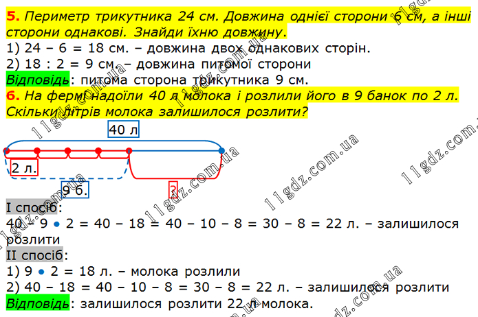 Периметр трикутника 24 см . Довжина однієї сторони 6 см, а інші сторони однакові . Знайди їхню довжину. На фермі надоїли 40 л молока і розлили його в 9 банок по 2 л. Скільки літрів молока залишилося розлити?