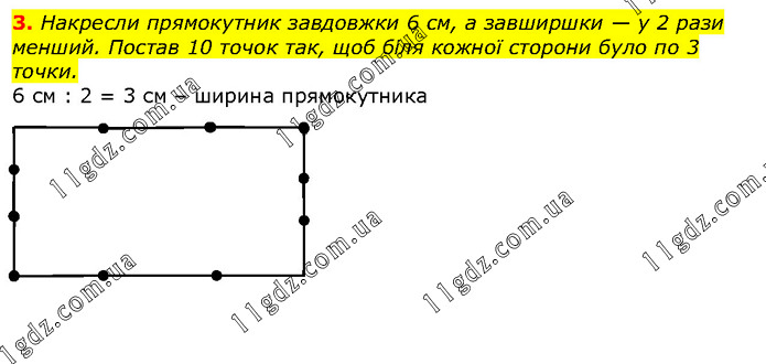 Накресли прямокутник завдовжки 6 см, а завширшки — у 2 рази менший. Постав 10 точок так, щоб біля кожної сторони було по 3 точки.