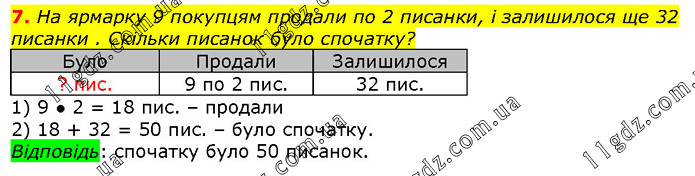 На ярмарку 9 покупцям продали по 2 писанки, і залишилося ще 32 писанки . Скільки писанок було спочатку?