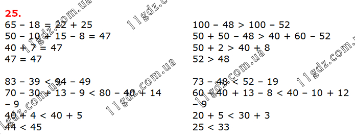 65 – 18 = 22 + 25 50 – 10 + 15 – 8 = 47 40 + 7 = 47 47 = 47 83 – 39 < 94 – 49 70 – 30 + 13 – 9 < 80 – 40 + 14 – 9 40 + 4 < 40 + 5 44 < 45 100 – 48 > 100 – 52 50 + 50 – 48 > 40 + 60 – 52 50 + 2 > 40 + 8 52 > 48 73 – 48 < 52 – 19 60 – 40 + 13 – 8 < 40 – 10 + 12 – 9 20 + 5 < 30 + 3 25 < 33
