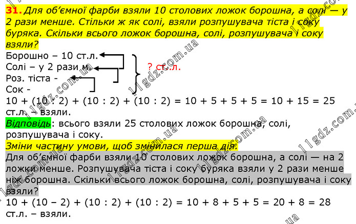 Для об’ємної фарби взяли 10 столових ложок борошна, а солі — у 2 рази менше. Стільки ж як солі, взяли розпушувача тіста і соку буряка. Скільки всього ложок борошна, солі, розпушувача і соку взяли?