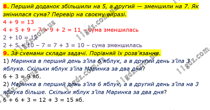 Перший доданок збільшили на 5, а другий — зменшили на 7. Як змінилася сума? Перевір на своєму виразі. 4 + 9 = 13 4 + 5 + 9 – 7 = 9 + 2 = 11 – сума зменшилась 2 + 10 = 12 2 + 5 + 10 – 7 = 7 + 3 = 10 – сума зменшилась 9. За схемами склади задачі. Порівняй їх розв’язання. 1) Маринка в перший день з’їла 6 яблук, а в другий день з’їла 3 яблука. Скільки яблук з’їла Маринка за два дня? 6 + 3 = 9 яб. 2) Маринка в перший день з’їла 6 яблук, а в другий день з’їла на 3 яблука більше. Скільки яблук з’їла Маринка за два дня? 6 + 6 + 3 = 12 + 3 = 15 яб.