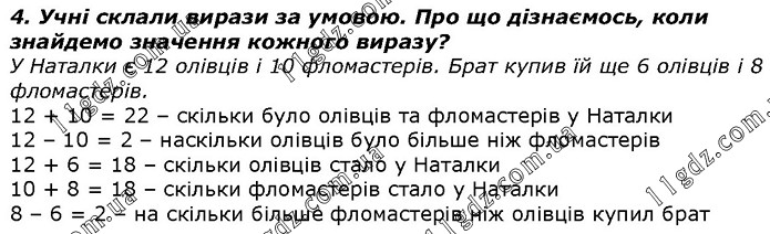 У Наталки є 12 олівців і 10 фломастерів. Брат купив їй ще 6 олівців і 8 фломастерів.
