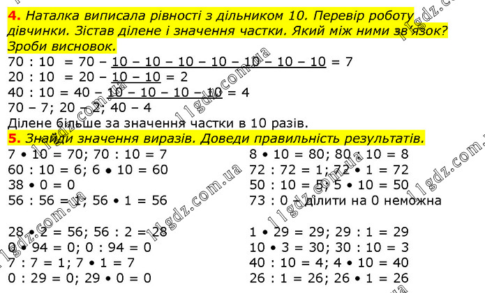 Наталка виписала рівності з дільником 10. Перевір роботу дівчинки. Зістав ділене і значення частки. Який між ними зв’язок?
