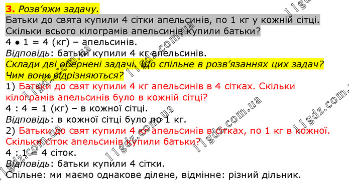 Батьки до свята купили 4 сітки апельсинів, по 1 кг у кожній сітці. Скільки всього кілограмів апельсинів купили батьки? Склади дві обернені задачі