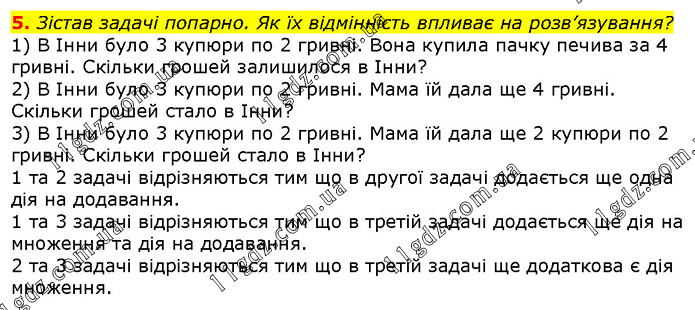 1) В Інни було 3 купюри по 2 гривні. Вона купила пачку печива за 4 гривні. Скільки грошей залишилося в Інни? 2) В Інни було 3 купюри по 2 гривні. Мама їй дала ще 4 гривні. Скільки грошей стало в Інни? 3) В Інни було 3 купюри по 2 гривні. Мама їй дала ще 2 купюри по 2 гривні. Скільки грошей стало в Інни?