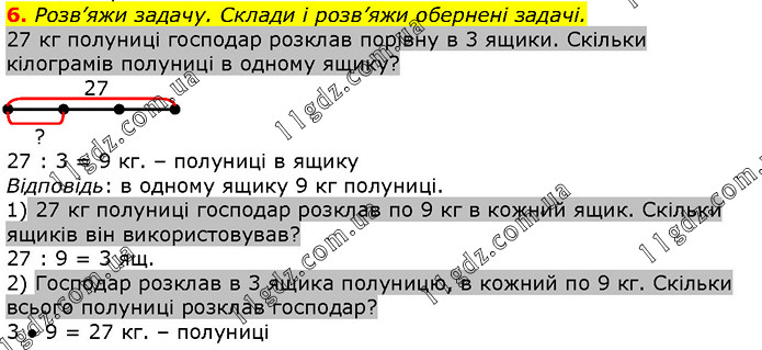 27 кг полуниці господар розклав порівну в 3 ящики. Скільки кілограмів полуниці в одному ящику? Склади і розв’яжи обернені задачі.