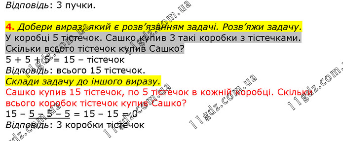 У коробці 5 тістечок. Сашко купив 3 такі коробки з тістечками. Скільки всього тістечок купив Сашко?