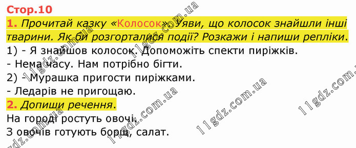Прочитай казку «Колосок». Уяви, що колосок знайшли інші тварини. Як би розгорталися події? Розкажи і напиши репліки. 1) - Я знайшов колосок. Допоможіть спекти пиріжків. - Нема часу. Нам потрібно бігти. 2) - Мурашка пригости пиріжками. - Ледарів не пригощаю. 2. Допиши речення. На городі ростуть овочі. З овочів готують борщ, салат.