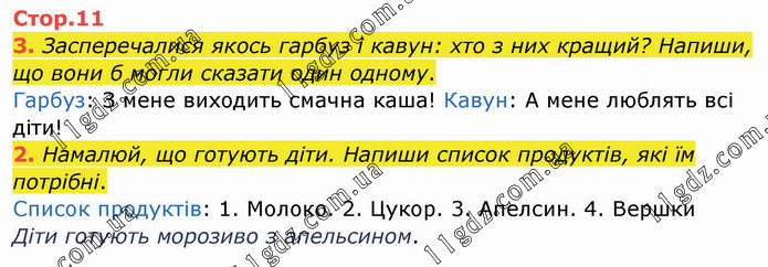 Засперечалися якось гарбуз і кавун: хто з них кращий? Напиши, що вони б могли сказати один одному. Гарбуз: З мене виходить смачна каша! Кавун: А мене люблять всі діти! 2. Намалюй, що готують діти. Напиши список продуктів, які їм потрібні. Список продуктів: 1. Молоко. 2. Цукор. 3. Апелсин. 4. Вершки Діти готують морозиво з апельсином.