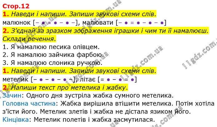 1. Наведи і напиши. Запиши звукові схеми слів. малюнок [– ● ᐀ ● – ● –], малювати [– ● ᐀ ● – ● – ●] 2. З’єднай за зразком зображення іграшки і чим ти її намалюєш. Склади речення. 1. Я намалюю песика олівцем. 2. Я намалюю зайчика фарбою. 3. Я намалюю слоника ручкою. 1. Наведи і напиши. Запиши звукові схеми слів. метелик [– ● – ● – ● –], літає [᐀ ● – ● ᐀ ●] 2. Напиши текст про метелика і жабку. Зачин: Одного дня зустріла жабка сумного метелика. Головна частина: Жабка вирішила втішити метелика. Потім хотіла з'їсти його. Метелик злетів і жабка не дістала язиком його. Кінцівка: Метелик полетів і жабка засмутилася.