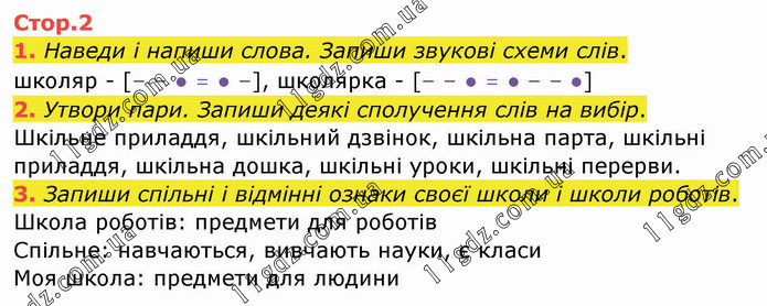 Наведи і напиши слова. Запиши звукові схеми слів. школяр - [– – ● ᐀ ● –], школярка - [– – ● ᐀ ● – – ●] 2. Утвори пари. Запиши деякі сполучення слів на вибір. Шкільне приладдя, шкільний дзвінок, шкільна парта, шкільні приладдя, шкільна дошка, шкільні уроки, шкільні перерви. 3. Запиши спільні і відмінні ознаки своєї школи і школи роботів. Школа роботів: предмети для роботів Спільне: навчаються, вивчають науки, є класи Моя школа: предмети для людини