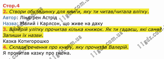 Створи обкладинку для книги, яку ти читав/читала влітку. Автор: Ліндгрен Астрід Назва: Малий і Карлсон, що живе на даху 3. Валерій улітку прочитав кілька книжок. Як ти гадаєш, які саме? Запиши їх назви. Казка Котигорошко 4. Склади речення про книгу, яку прочитав Валерій. Я прочитав казку про гнома.