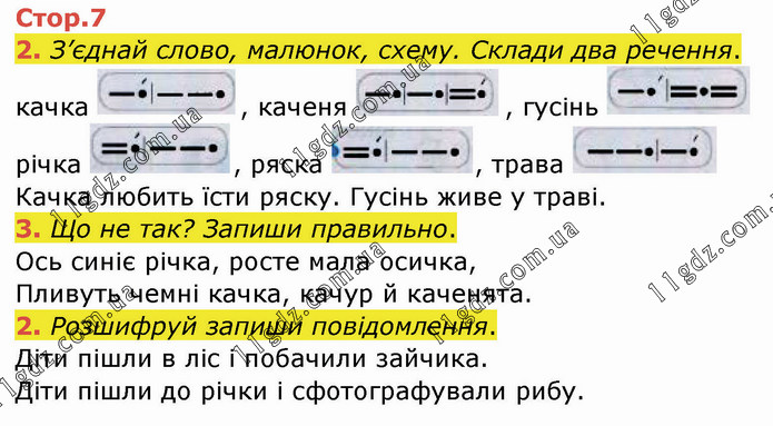 З’єднай слово, малюнок, схему. Склади два речення. качка , каченя , гусінь річка , ряска , трава Качка любить їсти ряску. Гусінь живе у траві. 3. Що не так? Запиши правильно. Ось синіє річка, росте мала осичка, Пливуть чемні качка, качур й каченята. 2. Розшифруй запиши повідомлення. Діти пішли в ліс і побачили зайчика. Діти пішли до річки і сфотографували рибу.