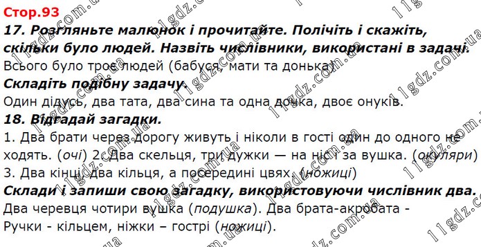 17. Розгляньте малюнок і прочитайте. Полічіть і скажіть, скільки було людей. Назвіть числівники, використані в задачі. Всього було троє людей (бабуся, мати та донька) Складіть подібну задачу. Один дідусь, два тата, два сина та одна дочка, двоє онуків. 18. Відгадай загадки. 1. Два брати через дорогу живуть і ніколи в гості один до одного не ходять. (очі) 2. Два скельця, три дужки — на ніс і за вушка. (окуляри) 3. Два кінці, два кільця, а посередині цвях. (ножиці) Склади і запиши свою загадку, використовуючи числівник два. Два черевця чотири вушка (подушка). Два брата-акробата - Ручки - кільцем, ніжки – гострі (ножиці).